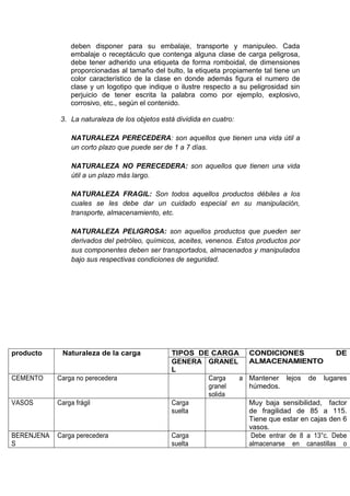 El documento proporciona información sobre la naturaleza de la carga, incluyendo definiciones de tipos de carga como carga general, carga fraccionada, carga unitarizada y carga peligrosa. También describe los diferentes tipos de embalajes y empaques primarios, secundarios y terciarios usados para proteger y transportar la carga, así como los contenedores y sitios de manejo de carga en Colombia.