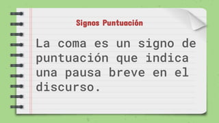 El documento habla sobre los diferentes tipos y usos de la coma en la puntuación. Explica que la coma se usa para hacer pausas breves y separar elementos en una lista, vocativos, complementos circunstanciales, oraciones subordinadas adversativas, y para omitir verbos. También cubre el punto y coma, dos puntos, y puntos suspensivos.