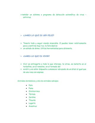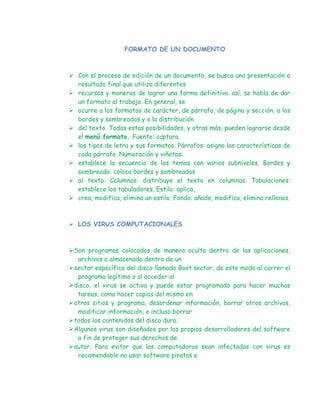 El documento habla sobre el formato de documentos y cómo se puede lograr una presentación final definitiva mediante recursos como el formato de fuente, párrafos, numeración, viñetas, bordes, sombreados y columnas. También describe brevemente qué son los virus de computadora, cómo se propagan e infectan otros archivos y sistemas, y la importancia de tener instalado un antivirus.