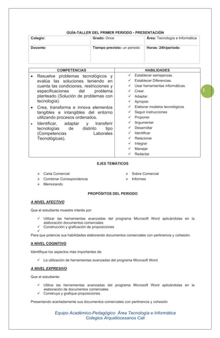 Este documento presenta una guía para el primer periodo de grado once en el área de tecnología e informática. El objetivo es que los estudiantes utilicen herramientas avanzadas de Microsoft Word para elaborar documentos comerciales. Se propone trabajar conceptos como cartas comerciales, memorandos y sobre comerciales. El periodo busca que los estudiantes mejoren sus habilidades en la elaboración de documentos comerciales usando Word.