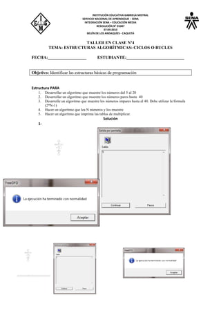 Este documento presenta un taller sobre estructuras algorítmicas de ciclos o bucles. El taller contiene 5 ejercicios que buscan identificar las estructuras básicas de programación como el ciclo PARA. Se pide desarrollar algoritmos para mostrar números entre rangos específicos y leer y mostrar números y tablas de multiplicar utilizando esta estructura de control de flujo.