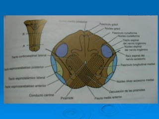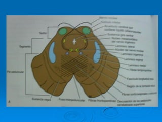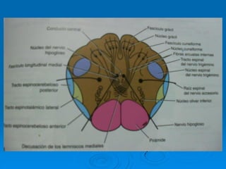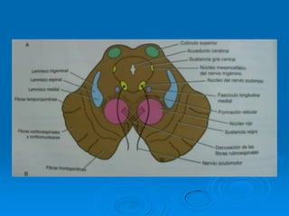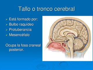 El documento describe la estructura y función del tallo cerebral. El tallo cerebral está formado por el bulbo raquídeo, la protuberancia y el mesencéfalo. Contiene centros importantes para funciones vitales como la respiración, circulación y conciencia. Además, contiene los núcleos de los nervios craneales III al XII. Describe las estructuras internas y externas de cada una de estas regiones del tallo cerebral.