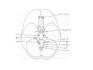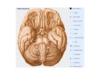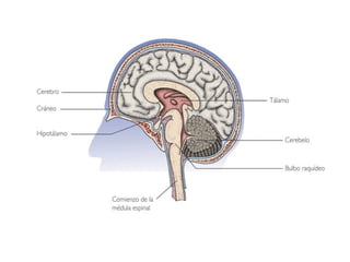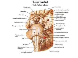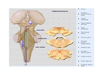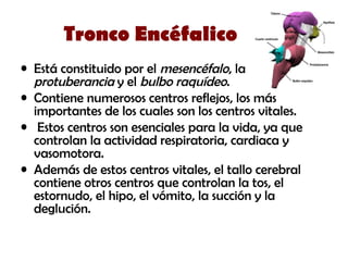El documento describe la anatomía y funciones del tronco encefálico. El tronco encefálico está constituido por el mesencéfalo, la protuberancia y el bulbo raquídeo. Contiene centros vitales que controlan funciones como la respiración, la circulación y la digestión. Además contiene centros que controlan la tos, el estornudo y otros reflejos.