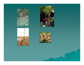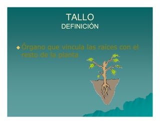 El documento describe los diferentes tipos de tallos en las plantas. Los tallos son órganos que conectan las raíces con el resto de la planta y sirven para soportar hojas y estructuras reproductivas y transportar agua y nutrientes. Los tallos se clasifican como aéreos, subterráneos o trepadores. Los tallos aéreos incluyen los erectos (herbáceos, leñosos, cañas, estípites) y los apoyantes u trepadores. Los tallos subterráneos incluyen bulbos