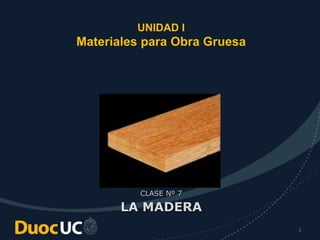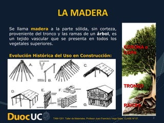 El documento proporciona una detallada introducción sobre la madera, su composición, propiedades, clasificación y procesos relacionados con su uso en construcción. Se discuten las especies madereras nativas y foráneas, así como los métodos de secado, las propiedades mecánicas y físicas, y las características comerciales de la madera. Además, se mencionan aspectos técnicos como la densidad, el contenido de humedad y la clasificación reglamentaria de la madera para su uso estructural.