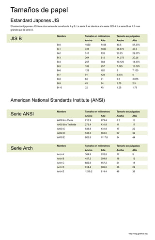 El documento describe los diferentes estándares de tamaños de papel utilizados en todo el mundo, incluyendo las series ISO, JIS, ANSI, Arch y tamaños de papel ingleses. El estándar ISO 216 es el más adoptado internacionalmente, aunque Estados Unidos y Canadá no lo siguen. La serie C se usa principalmente para carpetas, postales y sobres.