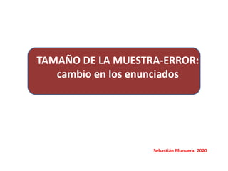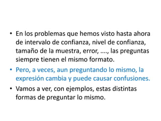 Este documento discute diferentes formas en que se pueden expresar los mismos conceptos estadísticos relacionados con el tamaño de la muestra y el error de muestreo. Explica que aunque la pregunta puede expresarse de manera diferente, siempre se está preguntando por el mismo concepto. Proporciona varios ejemplos de cómo se pueden expresar de forma equivalente conceptos como el intervalo de confianza, el error y la desviación típica.