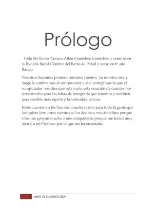 Este libro de cuentos contiene varios cuentos cortos escritos por un estudiante de sexto grado. Incluye un prólogo donde el autor se presenta y explica el proceso de escritura de los cuentos. Contiene un índice con los títulos de los cuentos y la página donde comienza cada uno. Los cuentos tratan sobre temas como animales que hablan, magos, niños, entre otros y varían en longitud.