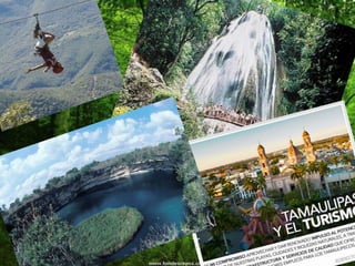 El documento menciona varias localidades y atractivos de Tamaulipas, incluyendo áreas naturales y espacios culturales. Se destacan lugares como la Barra del Tordo, Biosfera del Cielo y Playa Miramar. También se mencionan diferentes colonias y lagunas en la región.