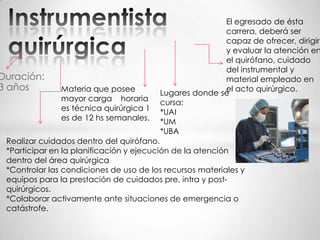 Este documento describe una carrera de 3 años relacionada con el cuidado quirúrgico. Los estudiantes aprenden a ofrecer, dirigir y evaluar la atención quirúrgica, así como el cuidado del instrumental y material quirúrgico. Los graduados podrán trabajar en quirófanos y participar en la planificación y ejecución de procedimientos quirúrgicos.