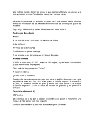 El documento habla sobre el tamizado como una operación unitaria para separar partículas de diferentes tamaños. Explica que el tamizado usa tamices con mallas calibradas para separar las fracciones presentes en una mezcla en rechazo y cernido. También describe diferentes tipos de tamices, parámetros como el número de mallas, y cómo se representan y analizan los resultados del tamizado.