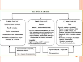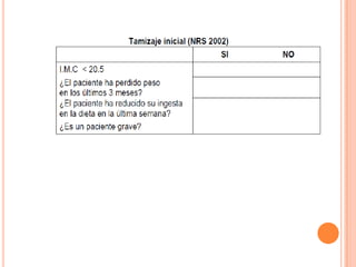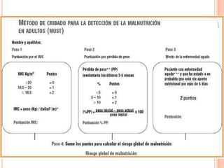 El tamizaje nutricional es el proceso de identificar características asociadas con problemas nutricionales en la población general para revelar quiénes necesitan una evaluación nutricional más detallada. Generalmente incluye parámetros como el índice de masa corporal, pérdida de peso reciente, ingesta dietética y gravedad de la enfermedad. Herramientas como el MST, MUST y VGS clasifican a los pacientes en función del riesgo nutricional para priorizar la intervención.