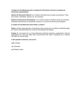 Un sistema de información manual utiliza procesos manuales mientras que un sistema automatizado transfiere tareas a elementos tecnológicos. Un hacker realiza trabajos legales con permiso pero un cracker viola sistemas de forma ilegal. Los dominios .com son portales, .ve sitios de Venezuela y .us de Estados Unidos.