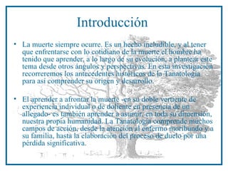 Este documento resume la tanatología, la disciplina que estudia la muerte. Explica que analiza la muerte y sus diagnósticos, así como los fenómenos cadavéricos. Describe los signos para determinar si una persona ha muerto, incluyendo la conciencia y sensibilidad. Además, explica los cambios químicos y físicos que ocurren en un cuerpo después de la muerte, como la lividez y rigidez cadavérica. Finalmente, distingue entre muerte aparente y real.