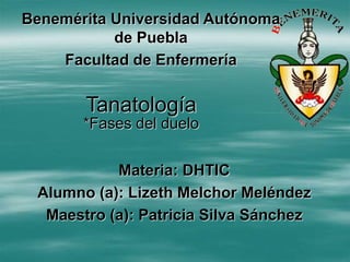 La tanatología es una disciplina que estudia la muerte y el proceso de duelo, ofreciendo cuidados paliativos a enfermos terminales y apoyo a sus familias. Este documento describe las fases del duelo, desde la negación hasta la aceptación, y los factores que influyen en su elaboración. También destaca la importancia del apoyo emocional en el contexto de la muerte y la necesidad de comprender el impacto de la pérdida en la vida de los individuos.