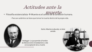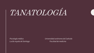 El documento trata sobre la tanatología y las actitudes ante la muerte. La tanatología se enfoca en proporcionar una muerte digna y en paz al enfermo terminal a través de atención al sufrimiento psicológico, físico y espiritual del paciente, así como a sus relaciones significativas y últimas voluntades. El documento también discute las diferentes reacciones ante la muerte como la negación, aceptación y duelo, así como el proceso del duelo y las posibles reacciones patológicas.