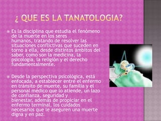 Este documento describe los conceptos fundamentales de la tanatología, que es la disciplina que estudia el fenómeno de la muerte. Explica los diferentes tipos de muerte, como la muerte aparente, súbita, violenta y natural. También detalla los pasos para diagnosticar la muerte real, incluyendo la pérdida de la conciencia, motilidad, sensibilidad y la ausencia de respiración y circulación.