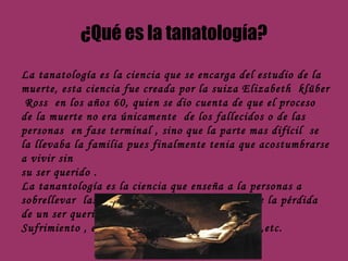 La tanatología es la ciencia que estudia la muerte y ayuda a las personas a sobrellevar la pérdida de un ser querido. Los tanatólogos acompañan a pacientes terminales y sus familias para enfrentar la muerte con esperanza y sin pendientes. También asisten a familias que enfrentan una muerte repentina e inesperada. La tanatología enseña que la muerte es natural y que el duelo es un proceso de cinco fases que con el tiempo permite sanar el dolor de la pérdida.