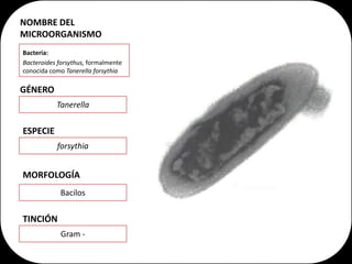 Este documento describe Tannerella forsythia, una bacteria asociada con la enfermedad periodontal. Detalla su morfología, hábitat, factores de virulencia como proteasas y su papel en la inducción de la pérdida ósea alveolar. También resume los métodos para cultivar la bacteria, realizar diagnósticos, y tratar infecciones y abscesos periodontales. Finalmente, resume un artículo sobre cómo la proteína BspA de T. forsythia induce la pérdida ósea en ratones a través de mecanismos infl