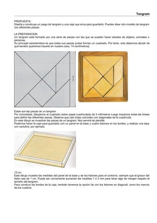 Este documento describe cómo diseñar y construir un juego de tangram y una caja para guardarlo. Explica que un tangram está formado por siete piezas que juntas forman un cuadrado y ofrece instrucciones para dibujar las piezas, cortarlas y ensamblar la caja con listones y un panel de contrachapado. Además, proporciona ideas para decorar y cerrar la tapa de la caja.