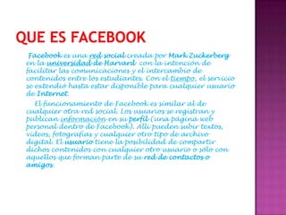 Facebook fue creada por Mark Zuckerberg en Harvard para facilitar la comunicación entre estudiantes y luego se expandió a todo público. Los usuarios se registran, crean un perfil personal y comparten texto, videos y fotos con sus contactos o de forma pública. Para unirse a Facebook, los usuarios deben registrarse en el sitio web e iniciar sesión para disfrutar de los servicios y buscar a sus amigos.