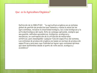La agricultura orgánica promueve la salud de los sistemas agrícolas y la biodiversidad mediante métodos agroecológicos y mecánicos en lugar de materiales sintéticos. Utiliza abonos orgánicos como el compost y estiércol animal, rotación de cultivos, y métodos naturales de control de plagas en lugar de agroquímicos. Aunque genera empleo rural y conserva el suelo, la agricultura orgánica enfrenta problemas como la tenencia de la tierra, la financiación y las políticas que fav
