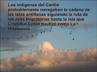 El documento analiza la relación de los taínos con las aves y su papel en la migración humana a las islas del Caribe, destacando la importancia de las aves en la cultura, alimentación y mitología taína. Describe cómo los taínos se convirtieron en expertos cazadores y agricultores, utilizando técnicas especiales para capturar aves y aprovechando los recursos que estas les brindaban. Además, se menciona la influencia de las aves en su calendario y cómo estas eran consideradas sagradas en sus creencias espirituales.