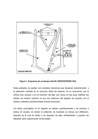 El documento describe el funcionamiento y diseño de los tanques Imhoff, una unidad de tratamiento de aguas residuales que integra la sedimentación y digestión de lodos. Los tanques Imhoff tienen tres compartimientos: cámara de sedimentación, cámara de digestión de lodos y área de ventilación. El documento explica el proceso de diseño de cada cámara y los requerimientos de mantenimiento para asegurar la correcta operación de la unidad.