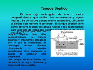 El documento habla sobre los tanques sépticos, los cuales son cajas enterradas que reciben excrementos y aguas negras para eliminar sólidos durante 1-3 días. El liquido que sale contiene alta concentración de materia orgánica y patógenos, por lo que se recomienda conducirlo a un campo de oxidación para tratamiento. Los tanques deben ser herméticos, duraderos y estructuralmente estables.