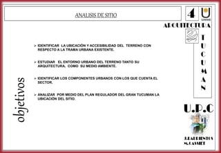 El documento realiza un análisis del sitio ubicado en la Sierra de San Javier en Tucumán, Argentina. Explica que el sitio formaba parte de un proyecto incompleto de 1948 para construir la Ciudad Universitaria de Tucumán. Incluye información sobre la ubicación, accesos, topografía, equipamientos existentes y entorno natural del sitio. Concluye que el sitio posee las características adecuadas para albergar un nuevo centro de convenciones que servirá a las universidades y la comunidad.