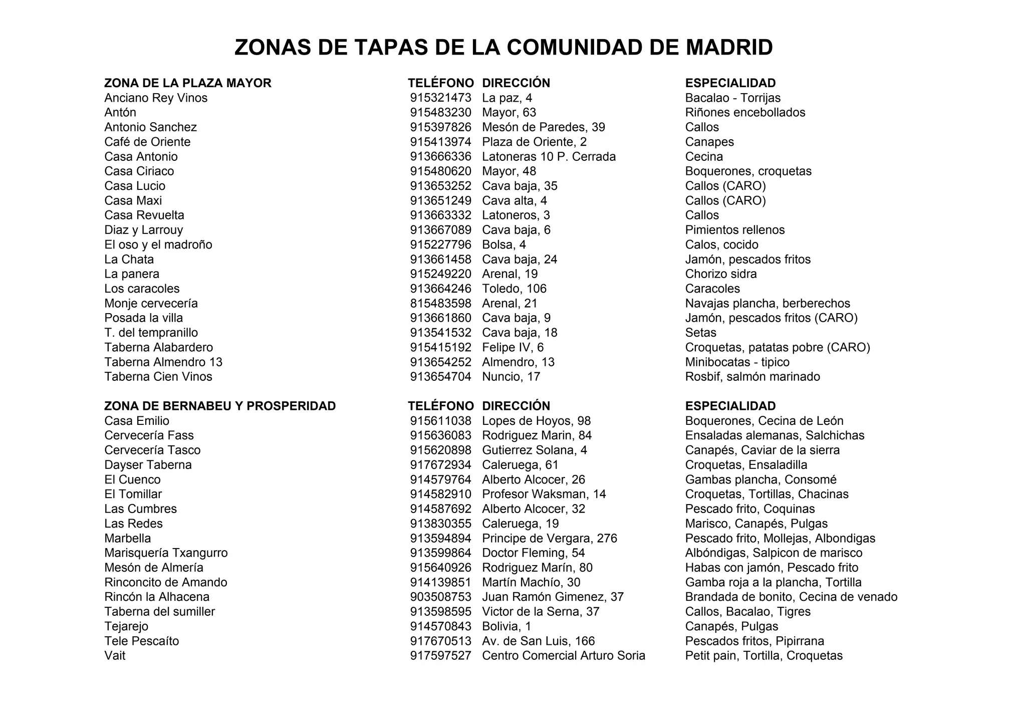 Este documento proporciona una lista de tabernas y zonas de tapas en la Comunidad de Madrid, incluyendo su teléfono, dirección y especialidades. Se dividen en diferentes zonas como Plaza Mayor, Bernabéu, Salamanca, Ventas y Chamberí. En total se enumeran más de 100 establecimientos con sus datos de contacto y platos típicos.