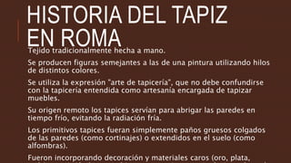 El documento describe la evolución y uso del tapiz y el mosaico en Roma, destacando su función decorativa y como aislante en tiempos fríos. También se menciona la variedad de muebles utilizados en las domus romanas, su diseño e influencia cultural. Además, se detalla la técnica de un tapiz específico que representa la conquista de Inglaterra por los normandos, reflejando la riqueza en temas y la complejidad del arte medieval.