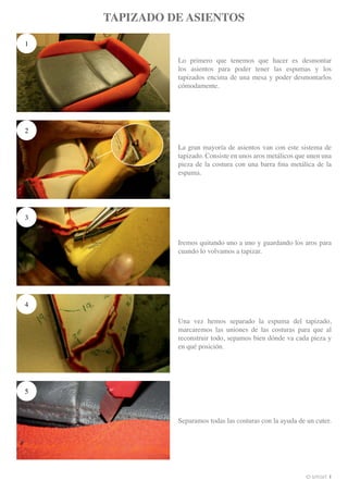 El documento proporciona instrucciones detalladas para revestir los asientos de un automóvil. Explica cómo desmontar los asientos para separar las espumas y tapicerías, marcar las uniones, separar las costuras, volver a unir las piezas con un nuevo tejido, y volver a montar los asientos utilizando anillas metálicas. También describe el proceso de revestir otros elementos del interior como pomos, puertas, salpicaderos y volantes.