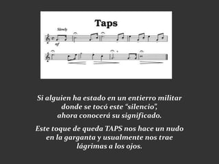 Este documento relata la historia detrás de la melodía militar conocida como "Taps". Explica que surgió durante la Guerra Civil Estadounidense cuando el Capitán Robert Elly arriesgó su vida para rescatar a un soldado herido en el campo de batalla, sólo para descubrir que se trataba de su propio hijo. El Capitán pidió permiso para darle a su hijo un entierro con honores militares a pesar de ser del bando enemigo, y eligió a un cornetero para que tocara una melodía