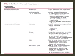 Este documento describe diferentes tipos de taquiarritmias cardiacas, incluyendo su definición, clasificación, mecanismos, características electrocardiográficas y tratamiento. Se definen las taquiarritmias como ritmos cardiacos con una frecuencia ventricular superior a 100 latidos por minuto, y se clasifican dependiendo de la regularidad del intervalo R-R y la morfología del complejo QRS. Se describen en detalle diferentes taquiarritmias como la taquicardia sinusal, taquicardia auricular, flúter aur
