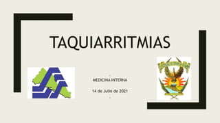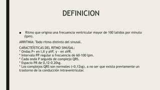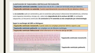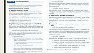 Este documento define las taquiarritmias y describe varios tipos como la taquicardia supraventricular paroxística, el flutter auricular, y la fibrilación auricular. Explica sus mecanismos, manifestaciones clínicas, factores de riesgo, y tratamientos como la cardioversión eléctrica y la anticoagulación. También resume los tipos de taquicardia regular de QRS estrecho y discute el síndrome de Wolf-Parkinson-White.