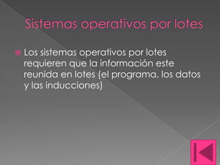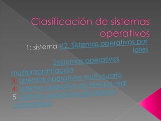 Este documento describe diferentes tipos de sistemas operativos, incluyendo sistemas por lotes que requieren que la información se agrupe en lotes, sistemas de multiprogramación que permiten múltiples procesos concurrentes en memoria principal, sistemas multiusuario que permiten acceso simultáneo a través de múltiples terminales, y sistemas de tiempo compartido que buscan distribuir los recursos de forma equitativa para dar la impresión a los usuarios de que tienen su propia computadora.