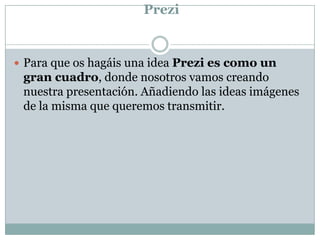 El documento presenta dos plataformas para crear presentaciones: Prezi, que permite crear una presentación como en un gran cuadro donde se añaden ideas e imágenes, y Zoho, que es un conjunto de aplicaciones web desarrolladas por una empresa india que permite crear presentaciones de forma gratuita aunque algunas herramientas están en fase beta.