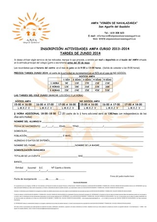 El documento informa a las familias sobre el horario escolar y de comedor durante el mes de junio, así como sobre las actividades extraescolares. Se recuerda que el horario escolar es de 9:00 a 13:00 y el de comedor de 13:00 a 15:00. Se solicita a las familias que indiquen si sus hijos no asistirán a las actividades extraescolares en junio. El horario de estas actividades se adelanta una hora, comenzando a las 15:00, excepto judo y chino que empiezan a las 14:00.