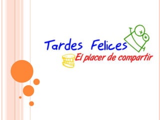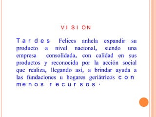 Tardes Felices es una empresa dedicada a la elaboración de postres con el fin de recaudar fondos para apoyar emocional y económicamente a fundaciones y hogares geriátricos con pocos recursos. La empresa busca expandirse a nivel nacional para llegar a más personas necesitadas, mientras se consolida ofreciendo productos de calidad reconocidos por su acción social.