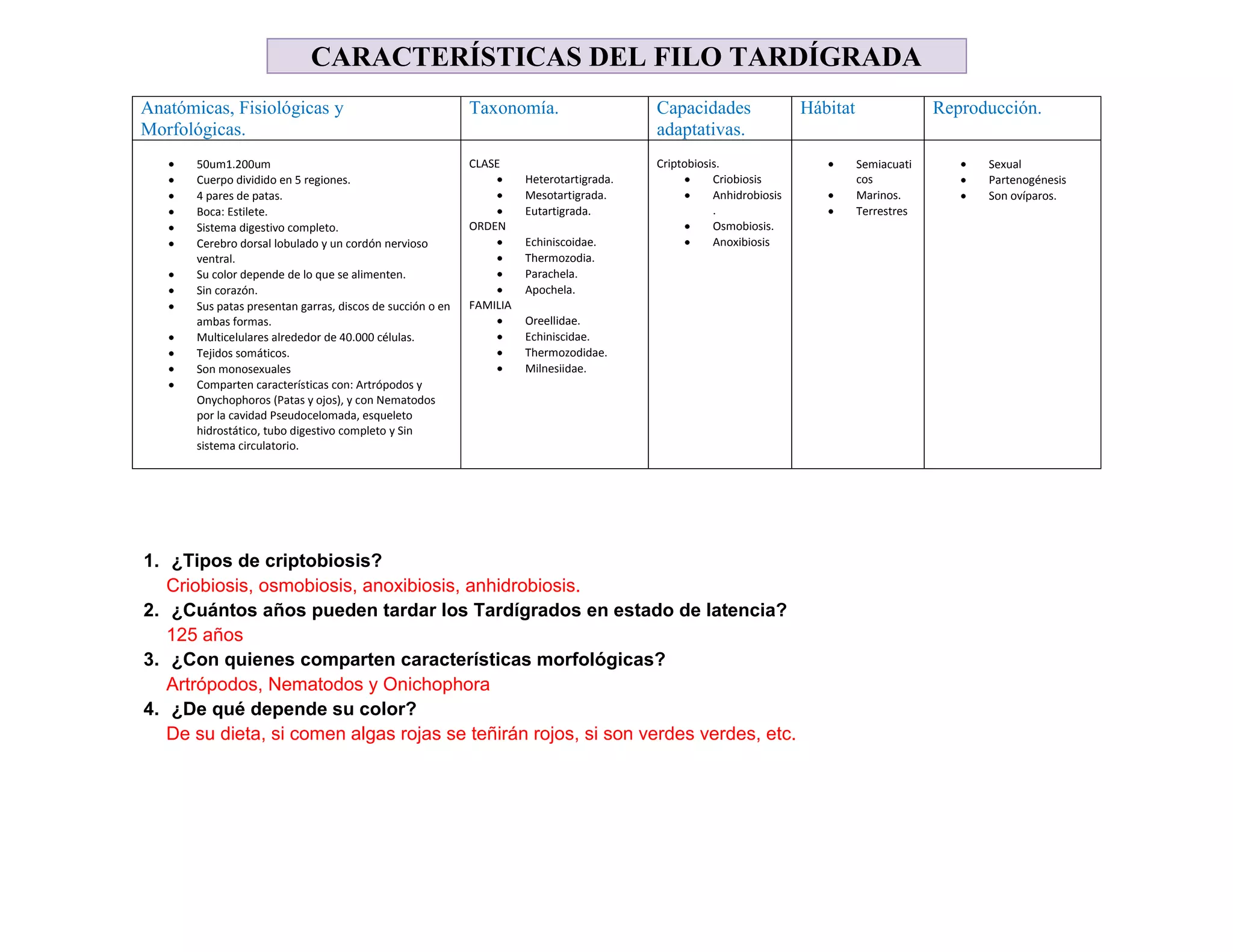 Los tardígrados o osos de agua presentan cuatro tipos de criptobiosis que les permiten sobrevivir en condiciones extremas como la criobiosis, osmobiosis, anhidrobiosis y anoxibiosis. Pueden permanecer en estado latente durante 125 años y comparten características morfológicas con artrópodos, nematodos y onicóforos. Su color depende de su dieta.