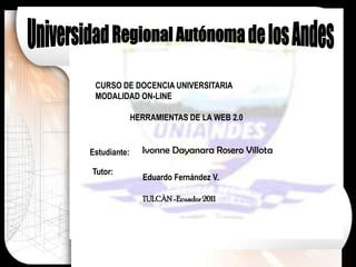 Este documento describe las herramientas de la Web 2.0 y cómo pueden usarse para la docencia universitaria en línea. Define la Web 2.0 como aplicaciones que fomentan la colaboración y reemplazan las aplicaciones de escritorio. Explica que el trabajo colaborativo facilita el trabajo en equipo y ahorra tiempo y dinero. También sugiere que los blogs podrían ser útiles para que profesores y estudiantes compartan conocimiento.