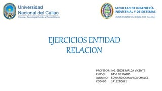 El documento presenta 6 ejercicios de modelado entidad-relación. Cada ejercicio describe un escenario de negocio diferente e incluye los requerimientos de información. Se pide diseñar el modelo entidad-relación para cada escenario describiendo las entidades, atributos y relaciones.