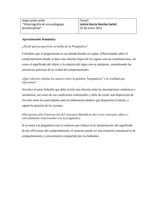 La pragmática estudia la relación entre los signos lingüísticos, su interpretación y el contexto. Se originó en el siglo XX con filósofos como Morris y Carnap. Examina cómo factores como el contexto comunicativo y el conocimiento compartido influyen en el significado y la interpretación. La pragmática también está relacionada con nuestras actitudes, visión del mundo y acciones, ya que el lenguaje refleja y da forma a cómo interactuamos con el entorno.