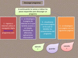El documento habla brevemente sobre las aplicaciones informáticas en internet y la descarga de programas. Explica que la descarga directa permite descargar archivos de un servidor sin esperar en colas y que existen empresas que ofrecen almacenamiento. También detalla los pasos para descargar un programa desde internet y los pasos para instalar correctamente un programa descargado.