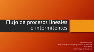 Este documento describe dos tipos de flujos de procesos: lineales y intermitentes. Los procesos lineales se caracterizan por una secuencia lineal de operaciones para una alta producción de un solo producto y requieren una alta inversión. Los procesos intermitentes se caracterizan por una producción mediana o baja por pedido y son más flexibles para producir diferentes productos. El documento también proporciona ejemplos de cada tipo de proceso.