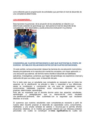 Una competencia requiere la combinación de capacidades como conocimientos, habilidades cognitivas y socioemocionales para responder efectivamente a desafíos. Los estándares de aprendizaje describen el desarrollo de competencias a través de los niveles escolares, mientras que los desempeños muestran el nivel de desarrollo de competencias en situaciones específicas. Para que los estudiantes sean competentes, se debe enseñar conocimientos y habilidades aplicables y promover el desarrollo de capacidades a través de retos signific