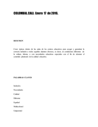El documento argumenta que las escuelas deben crear condiciones óptimas para acoger y garantizar la correcta inclusión de todos los estudiantes diversos, con el fin de lograr una mejor calidad educativa. Señala que la atención a la diversidad en el aula, como aceptar a estudiantes de diferentes culturas, idiomas o con necesidades educativas especiales, es fundamental para este propósito. También resalta que la escuela, familia y sociedad deben trabajar juntos para mejorar el sistema educativo de una manera inclusiva.