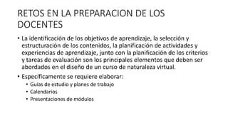 El documento describe los retos y habilidades requeridos para los docentes en entornos de enseñanza virtual. Explica que los docentes deben planificar objetivos, contenidos, actividades y criterios de evaluación para cursos virtuales. También deben cumplir roles como tutoría individual y grupal, actualización de información, evaluación de trabajos y coordinación con otros profesores. Finalmente, el documento concluye que la herramienta virtual es indispensable actualmente, pero requiere planificación y que el docente acompañe activamente el proceso de enseñanza
