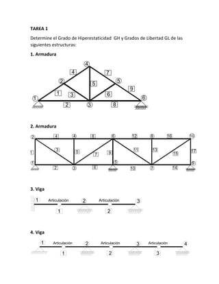 La tarea 1 pide determinar el grado de hiperestaticidad (GH) y los grados de libertad (GL) de diferentes estructuras como armaduras, vigas y marcos. Se deben calcular estos valores para 6 estructuras distintas, incluyendo 2 armaduras, 2 vigas y 2 marcos, para analizar su comportamiento estático.